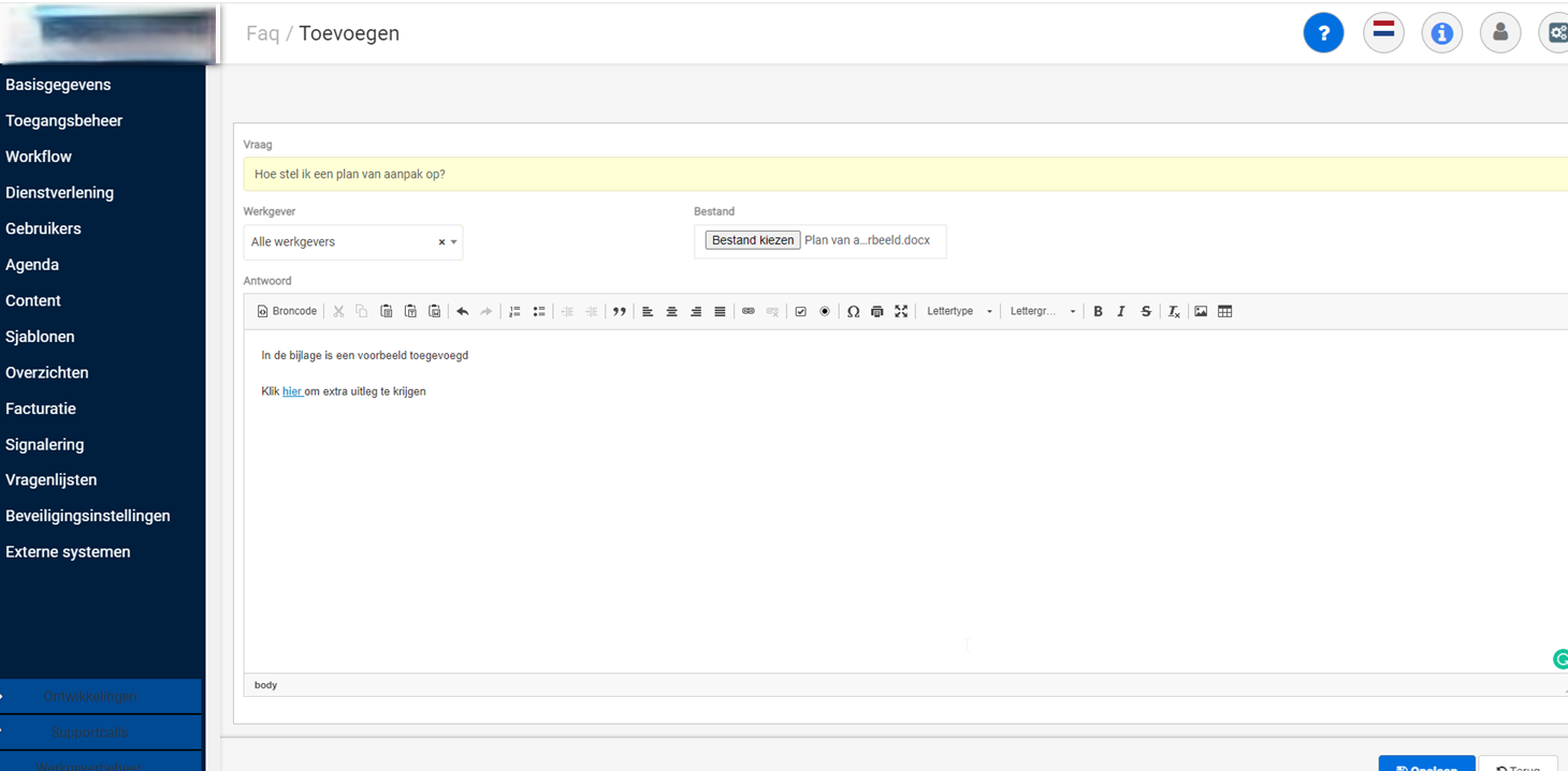 Om ervoor te zorgen dat een gebruiker van BlueVi zo efficiënt mogelijk gebruikmaakt van de software, is het onderdeel Faq (frequently asked questions) beschikbaar in het standaard dashboard van het werkgeverportaal. In dit onderdeel kun je heel eenvoudig tips, links naar instructiefilmpjes en documenten opnemen. Op deze manier kun je de kennis van werkgevergebruikers continu verbreden en up-to-date houden. In onderstaand voorbeeld vind je de uitleg voor het maken van een Plan van aanpak.