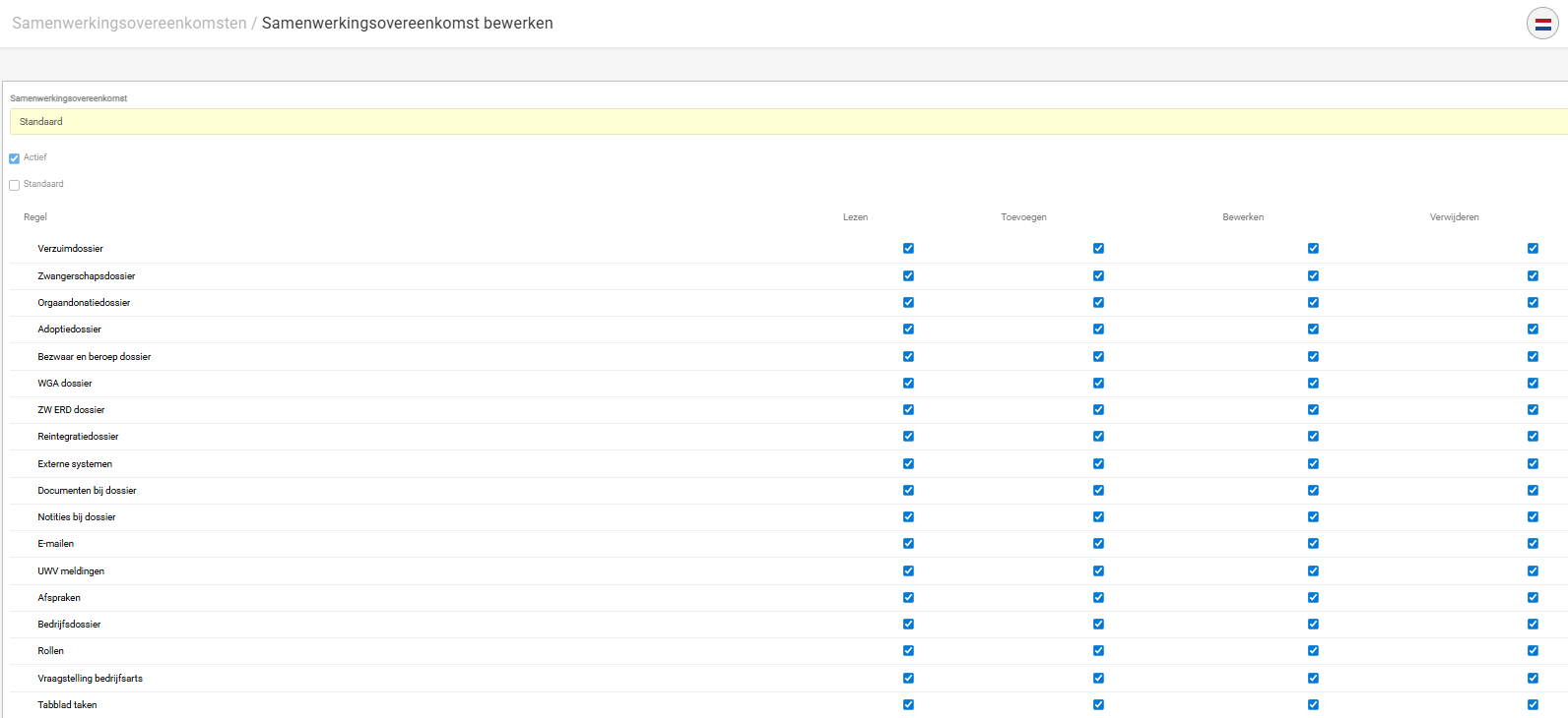 De opties omvatten toegangsniveaus zoals Lezen, Bewerken, Toevoegen en Verwijderen. Deze opties kunnen per samenwerkingsovereenkomst worden ingesteld: